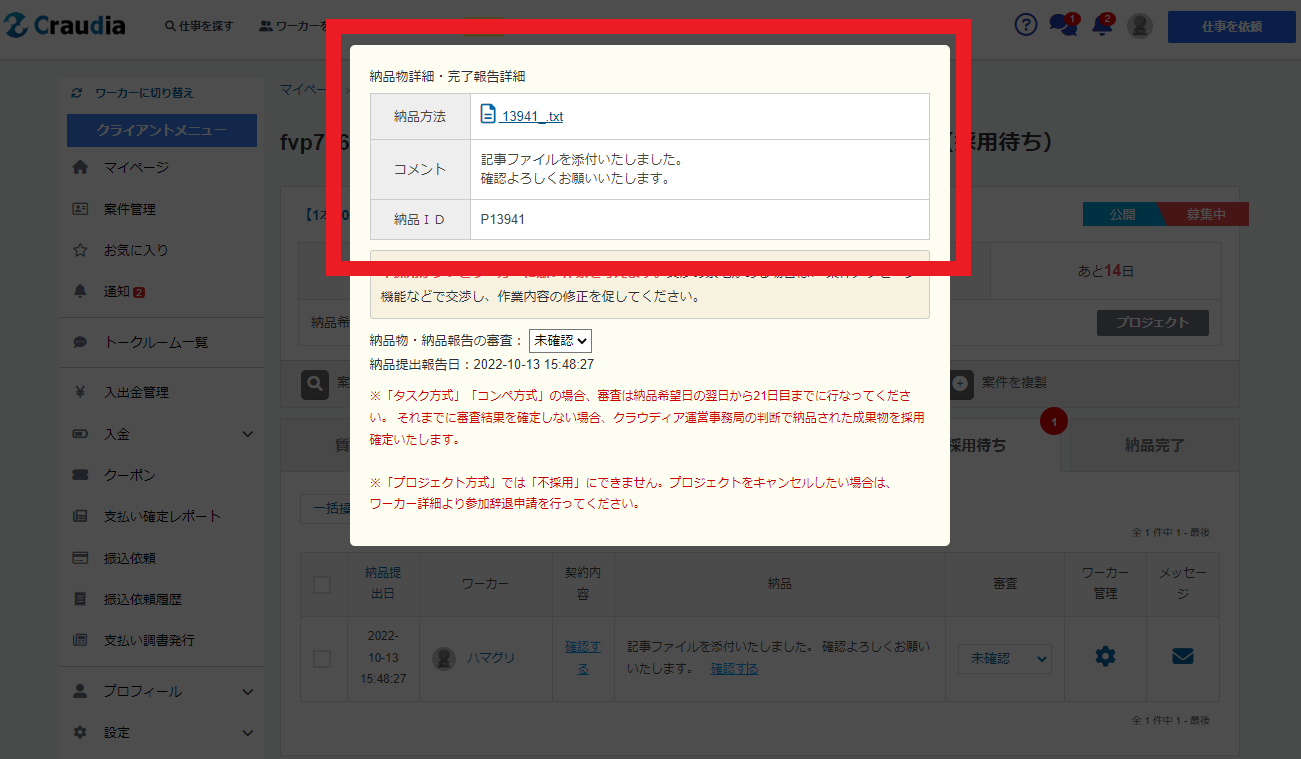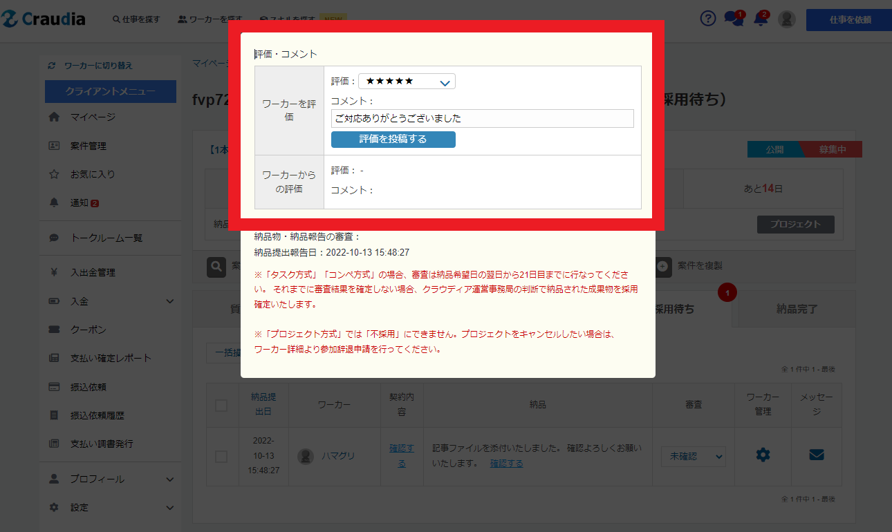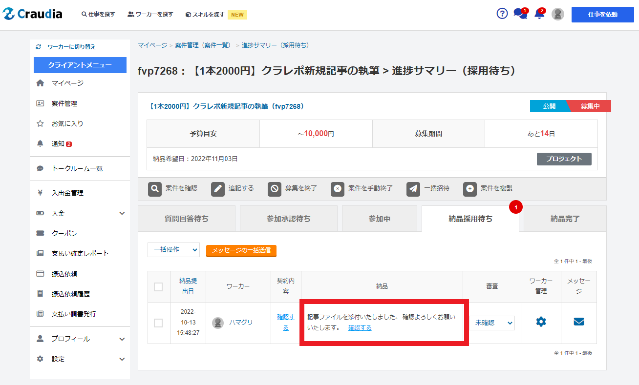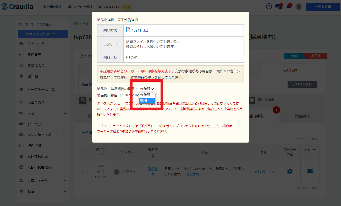 納品された制作物に問題がなければ「納品物・納品報告の審査」のプルダウンから「採用」を選択してください。