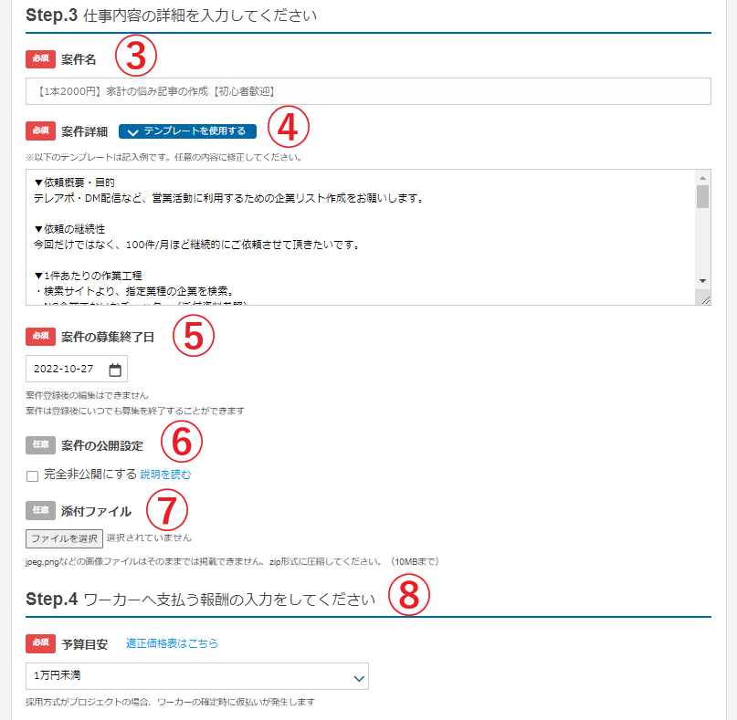 ⑧ ワーカーへ支払う報酬の予算を選択してください。
