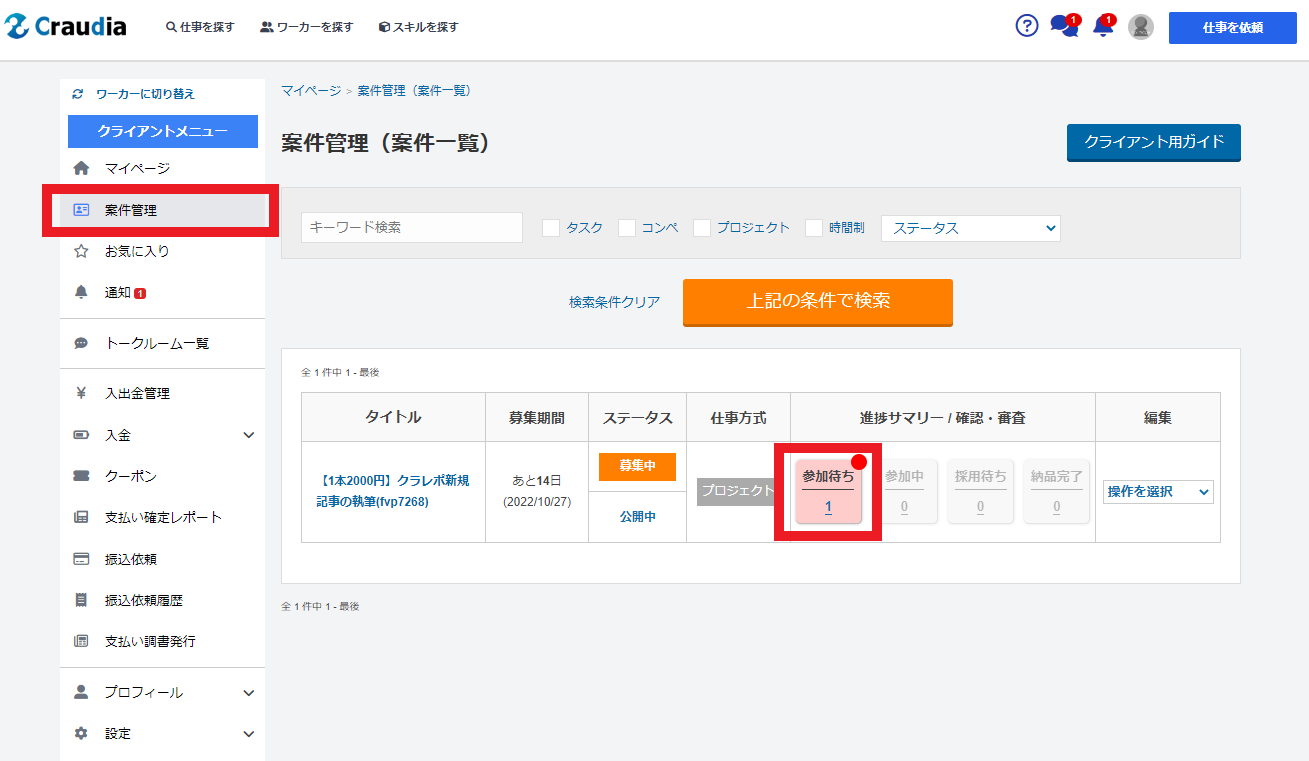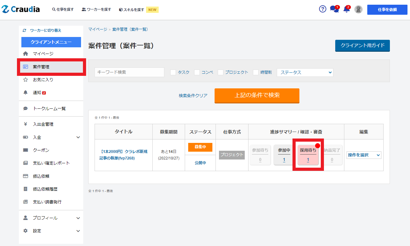 クラウディア運営事チームによる案件の審査が通ると、仕事一覧に掲載されます。