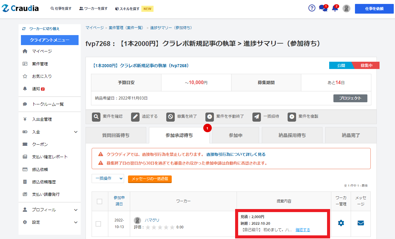 契約前に応募者のスキルや経歴を確認でき、必要に応じて見積もりを依頼することもできます。