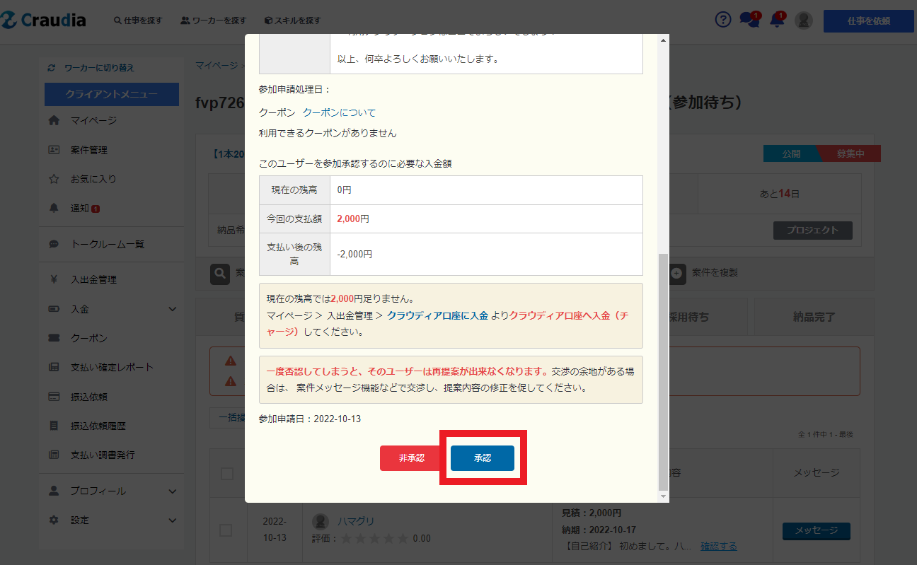 提案内容に問題がなければ「承認」ボタンをクリックしてください。