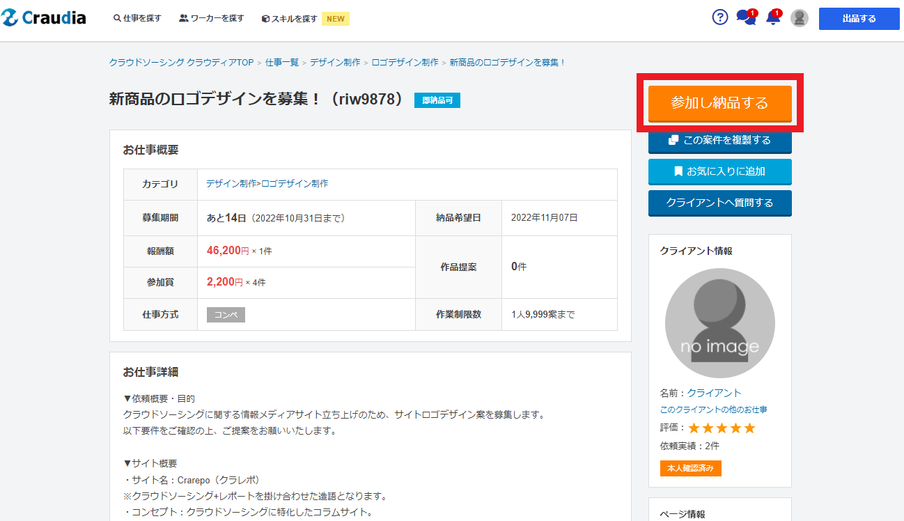 仕事の詳細を確認し「参加し納品する」ボタンをクリックします。