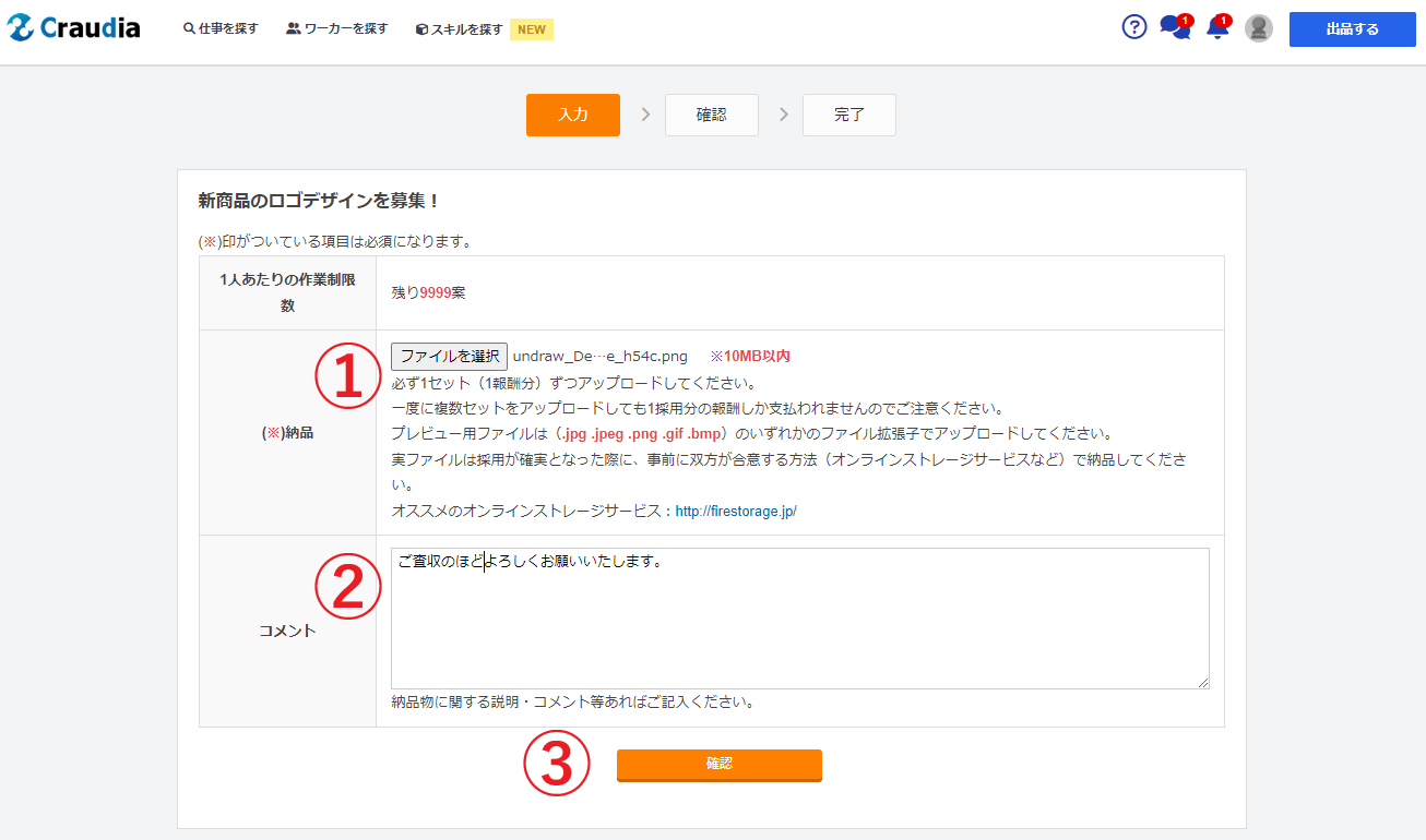 ① 納品ファイルがある場合、「ファイルを選択」からファイルを添付してください。