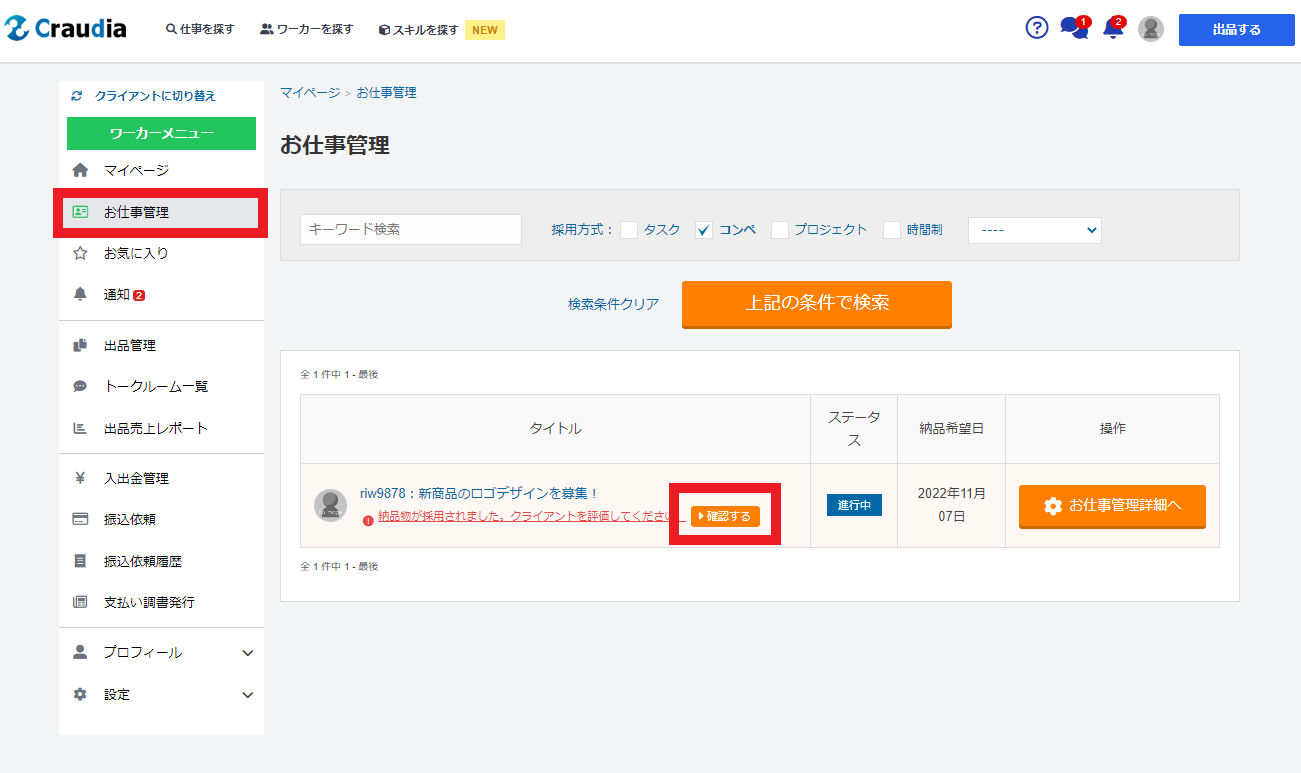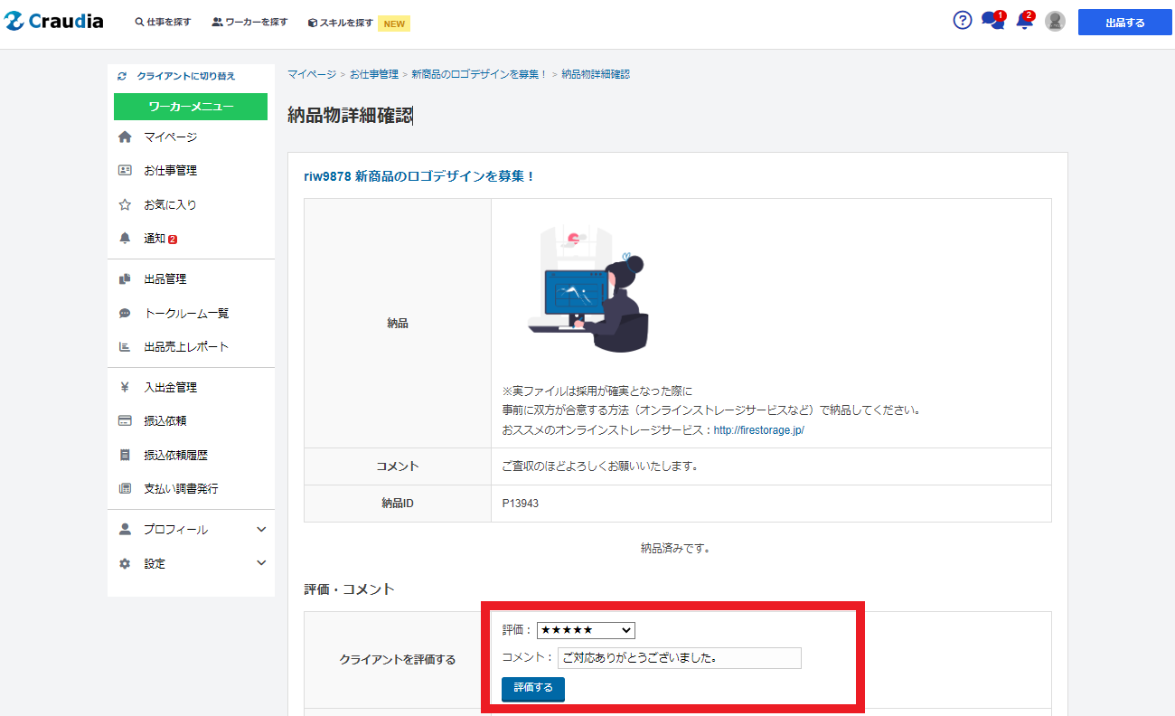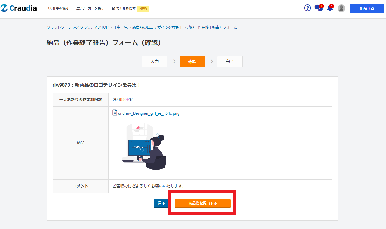 確認して問題がなければ「納品物を提出する」ボタンをクリックしてください。