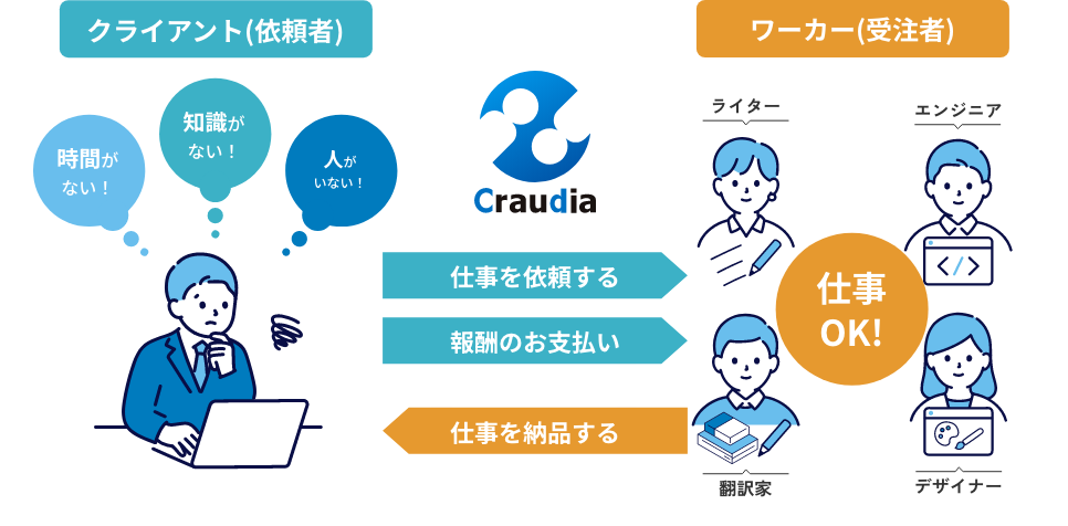 クラウディアは、全国(全世界)のクライアント(発注者)とワーカー(受注者)をマッチングするプラットフォームです。