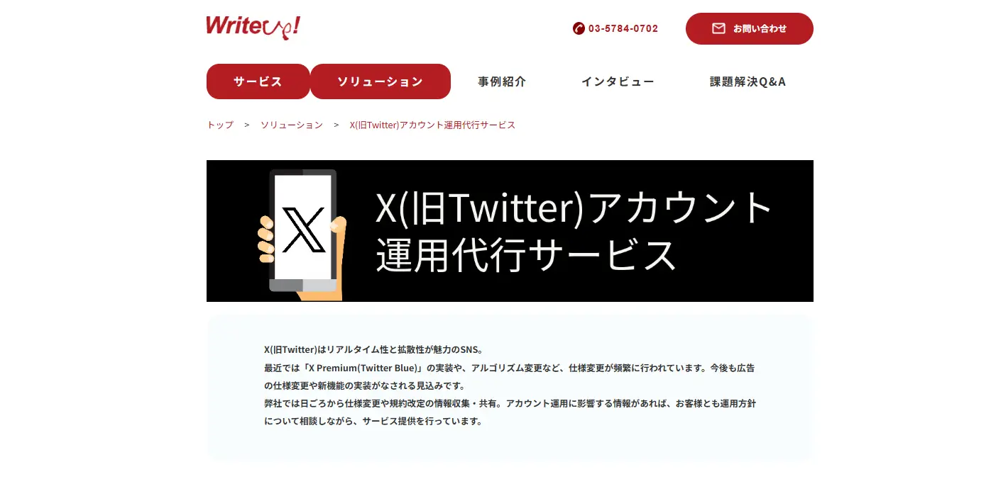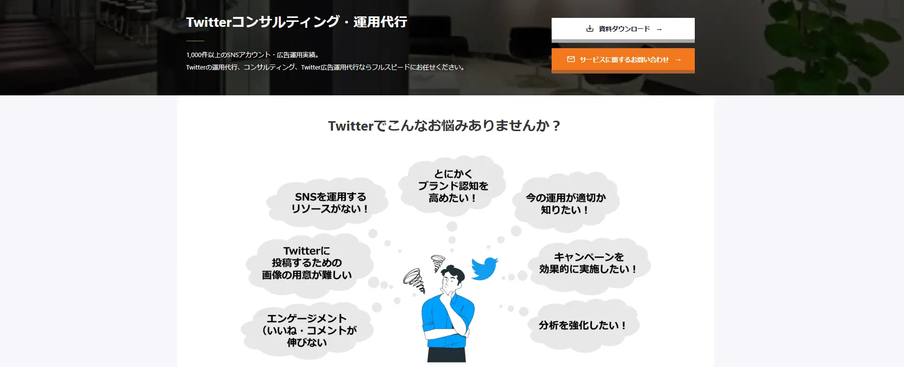 X(旧Twitter)運用の成功は継続性が重要になりますが、企画・投稿作成・分析まで手が回らないことも多いです。そこで本章では、運用代行からコンサル・研修型まで、目的に応じて選びやすい支援サービスを5社紹介します。支援範囲や契約形態は各サービスによって異なるため、社内の役割分担に合うかを軸に比較し確認しましょう。