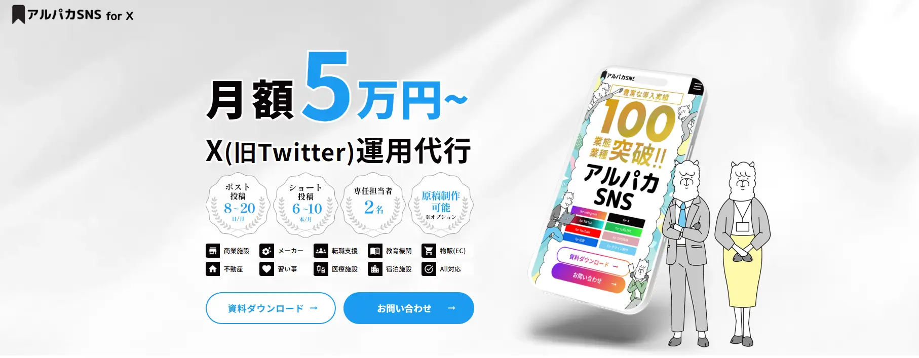 「アルパカSNS for X」は、月額5万円〜から始められるX(旧Twitter)運用代行サービスです。